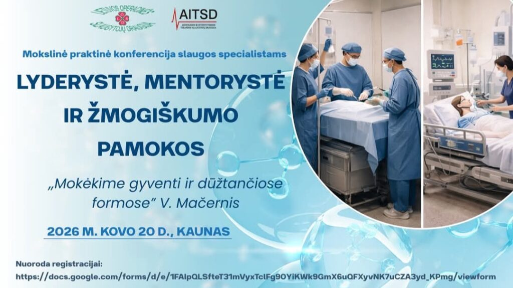 Kviečiame dalyvauti Lietuvos anestezijos ir intensyviosios terapijos slaugytojų draugijos ir Lietuvos operacinės slaugytojų draugijos organizuojamoje mokslinėje-praktinėje slaugos specialistų konferencijoje: „LYDERYSTĖ, MENTORYSTĖ IR ŽMOGIŠKUMO PAMOKOS”.